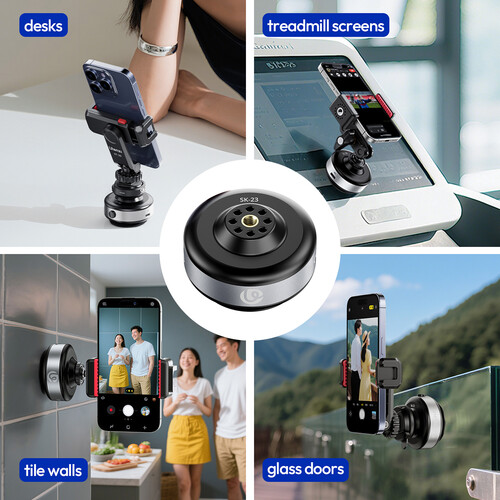 The SK-23 Electric Suction Base from Ulanzi is a lightweight suction base capable of supporting up to 2.2 lb. Attach the base to desks, smooth walls, glass, and more by activating the suction with a single press. The base auto-adjusts suction strength to keep gear steady under movement, and features a 1/4"-20 thread hole with ARRI locating holes for mounting.