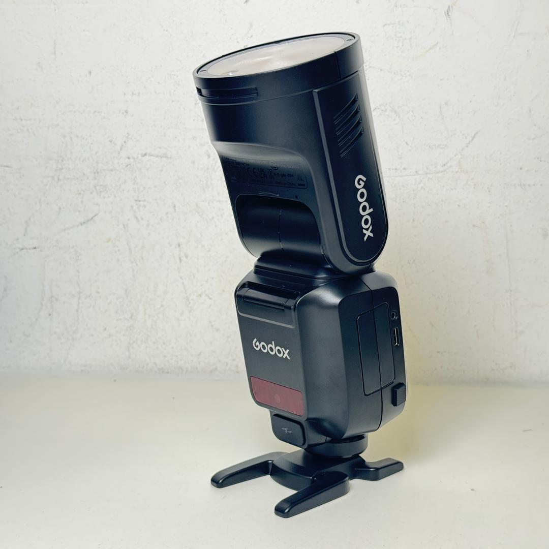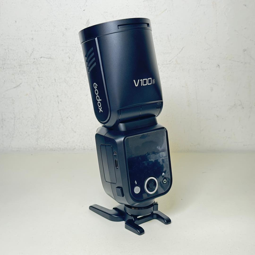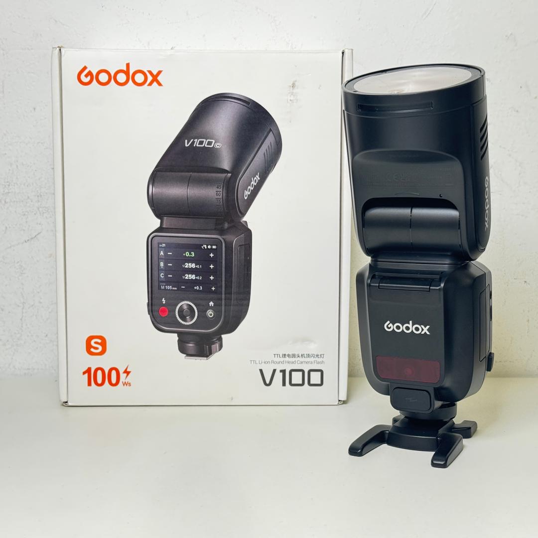 With a powerful 100W output and an innovative round head design, the V100 Flash for Sony from Godox is a compact and easy-to-use flash for portrait photographers. Designed with an integrated sub-flash, the V100 offers a 100W output and is ideal for on-location shooting. Its advanced cooling design allows for continuous shooting, offering 70 to 100 consecutive flashes with a 1/1 to 1/256 power range. The built-in 2W modeling lamp and automatic 28-105mm zoom range allows for more lighting control. The 1.7 second recycling time and the -7 to 120° tilt with 330° rotation offers greater flexibility and is compatible with Sony ADI / P-TTL systems. Easily control settings with its large touch screen back and charge the batteries directly with a USB-C cable. The V100 is also compatible with Sony cameras featuring a global shutter.