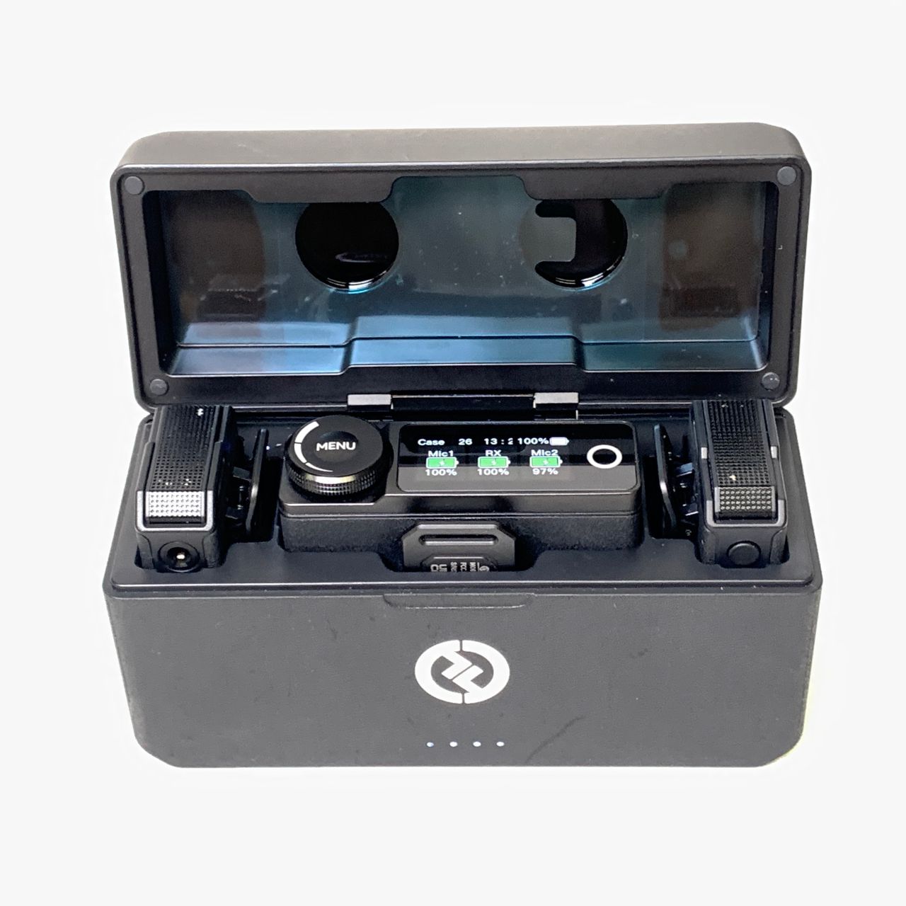Included with the system is a compact charging case capable of extending the runtime of each component to a total of 22 hours when fully charged. Each transmitter on its own has a 7.5-hour runtime, while the receiver has a 9-hour runtime and can be charged and operated simultaneously. LED indicators on the case allow you to monitor its battery status.