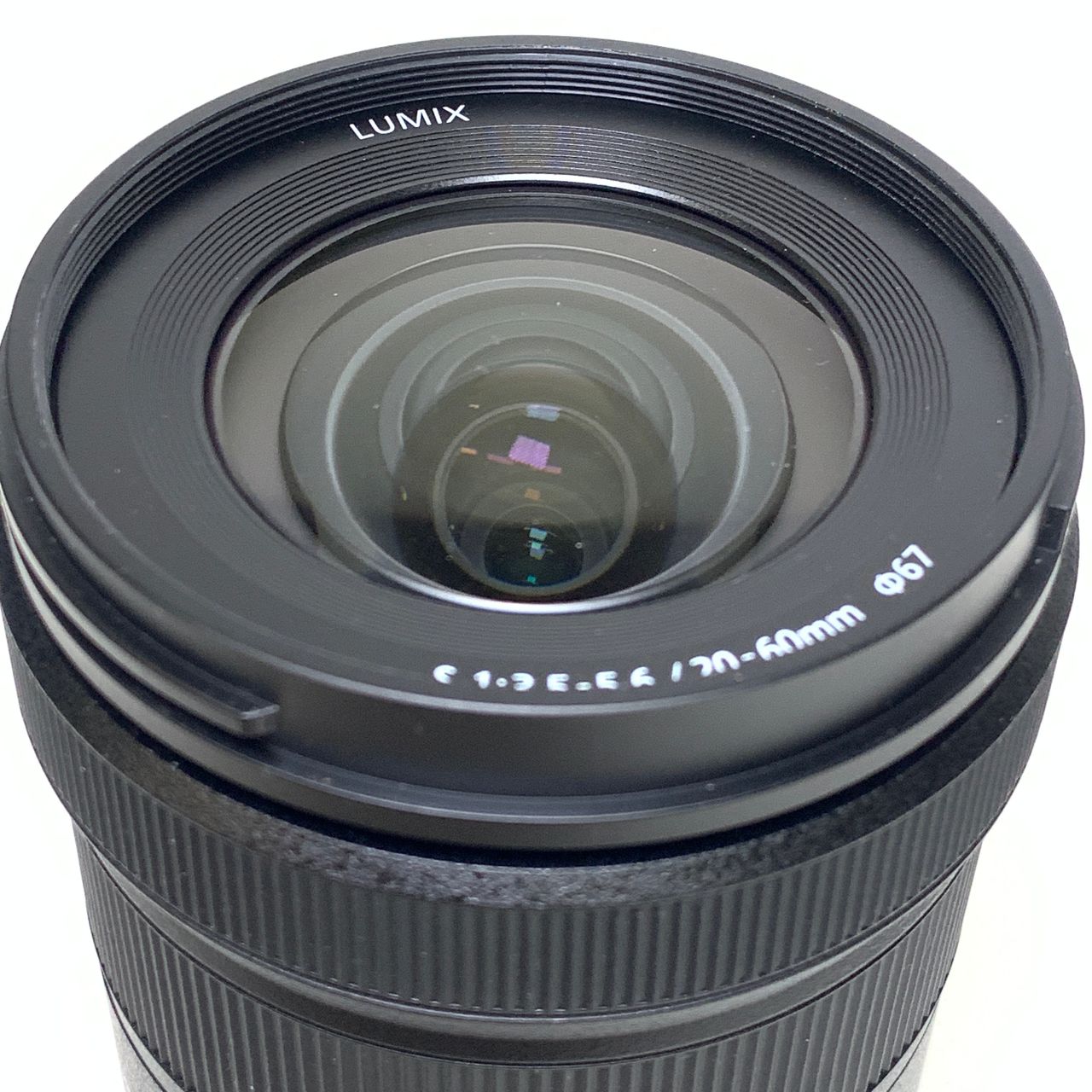 Fluorine coating has been applied to the front element to prevent dirt and oils from sticking to lens.
